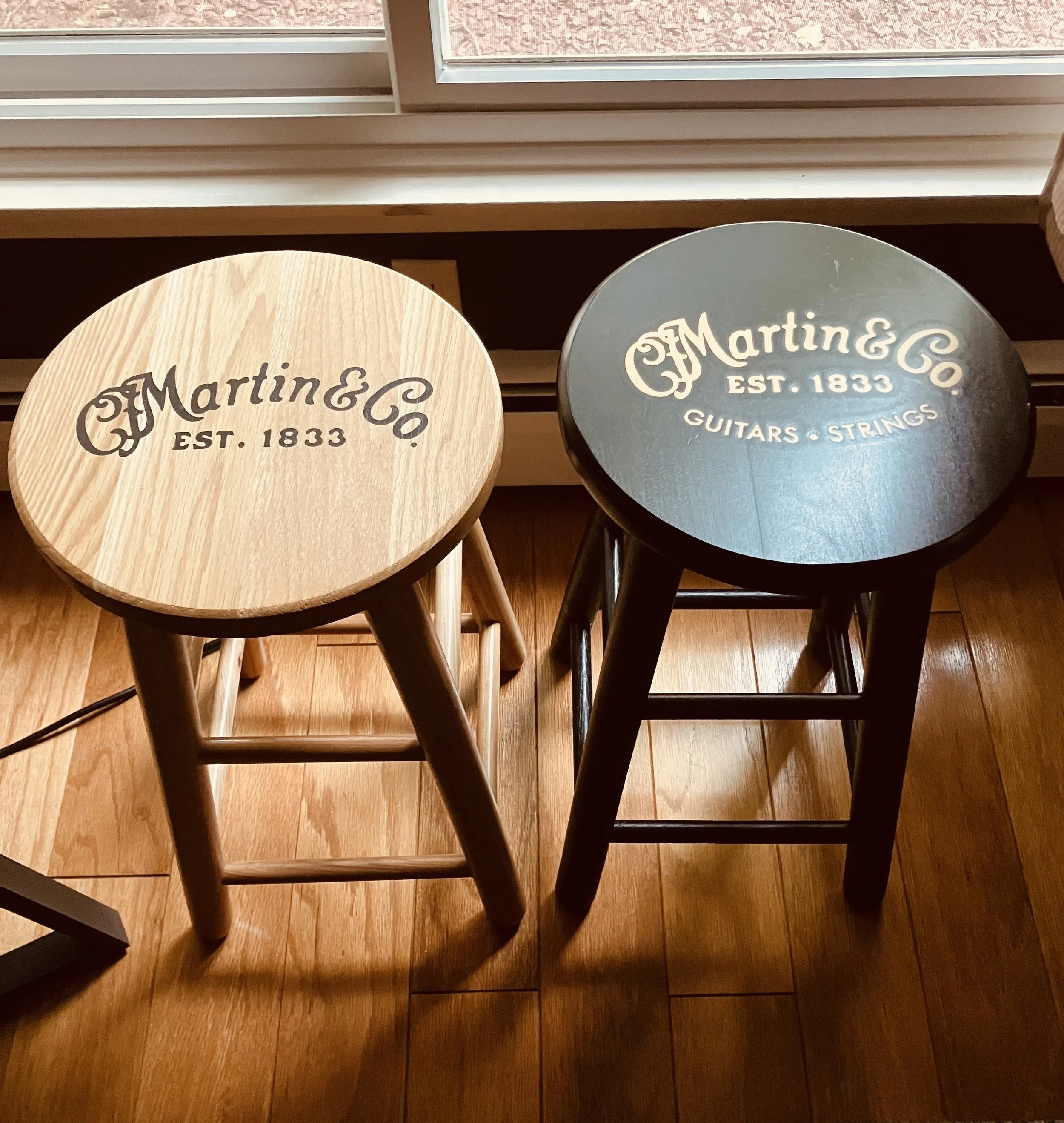 Two Martin Guitar Stools - Martin logo, sturdy all ash wood, 24" tall, the perfect stool! No longer offered for sale by Martin, these “Vintage” stools are just what every guitarist needs in their music room! Valued at $100 each